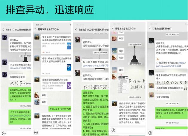 1月底疫情爆发,全体辅导员立刻从休假状态转换到工作状态,第一时间摸查所带学生现状,启动学生信息日报告制度至今,辅导员老师们已经坚持连续60天排查学生信息,保持24小时通讯畅通,完成学生基本情况日报告。学校启用线上签到小程序后,辅导员老师每日对后台收集的异常数据进行核实和跟进,并督促学生每日签到,确保准确实时掌握每一位同学的情况。掌握每位学生的健康状况和接触人员史等信息,做好学校、学院各项通知的传达、防疫知识的普及,协助做好线上教学工作,对学生的各项疑问及时答疑解惑。
