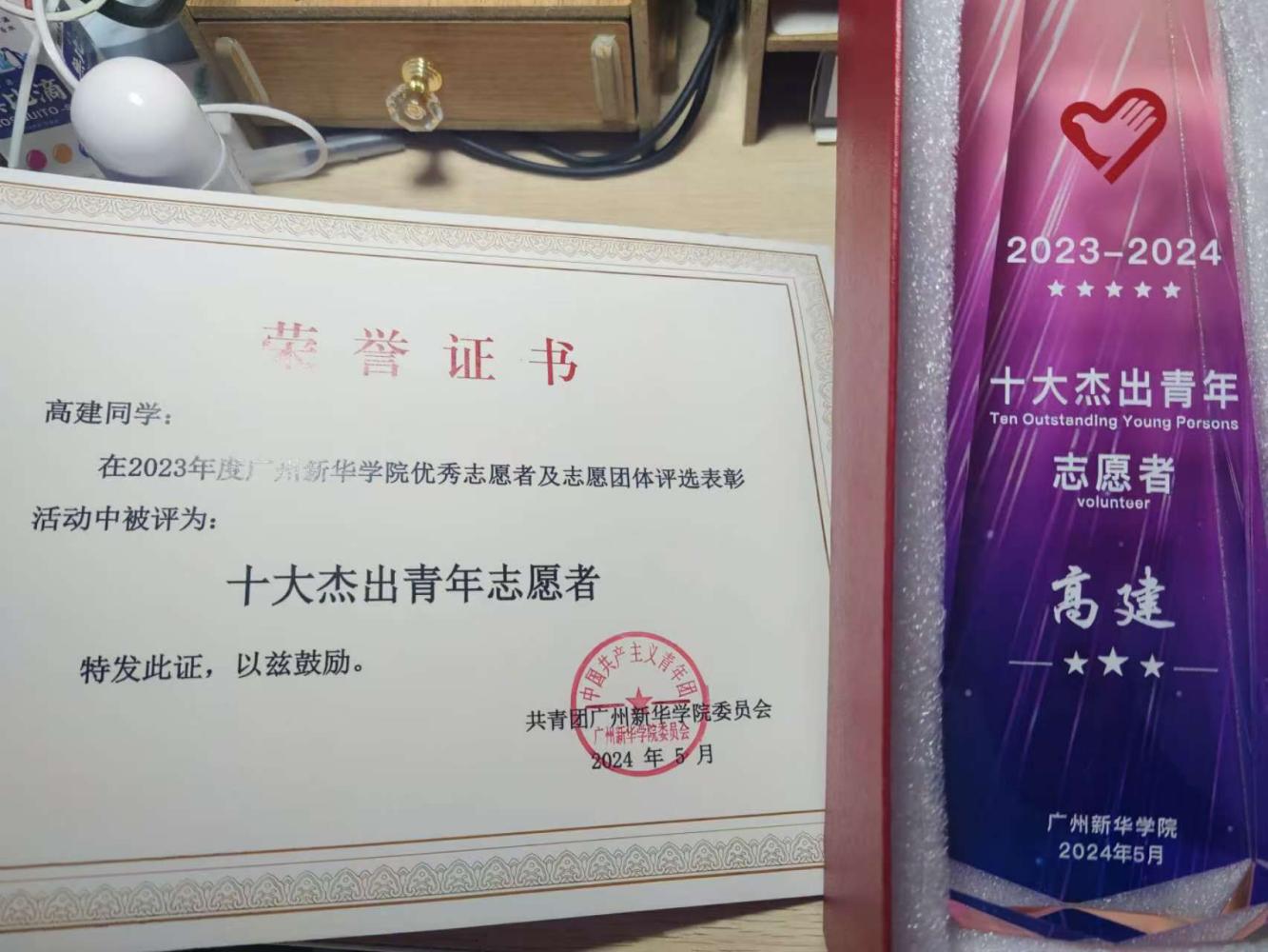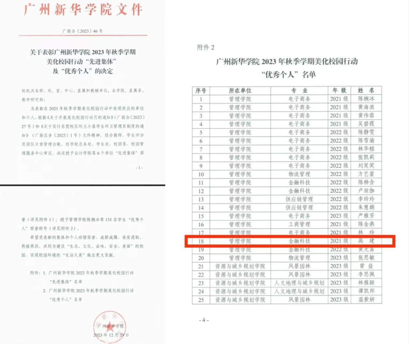 高建获广州新华学院2023年秋季学期美化校园行动“优秀个人”