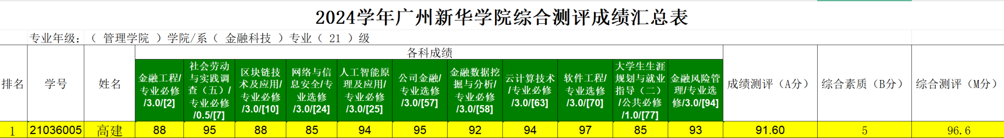 自迈入大学校园的那一刻起,高建便怀揣着明确的学业目标,以满腔的热忱投入到学习之中。高建完成的课程作业质量出类拔萃,在学习通平台上被选为“精品作业”,供同学们学习参考。在小组作业中,他思维敏捷,常常能提出独特的见解,引领团队高效协作。课后,高建对待学业的态度同样积极,一旦遇到问题,便主动向各位科任老师请教。不仅如此,高建还不断自我提升,积极考取各资格证书:英语六级、计算机二级、初级经济师证书、银行从业资格证等。这份执着与努力换来了优异的成绩,他连续三年荣获优秀学生奖学金,大学所学课程中有42门成绩突破90分,成绩优秀率超55%。在大三学年,多门专业课成绩突出,专业排名第一,综合测评高达96.60分,荣获2023-2024学年国家奖学金。这令人瞩目的成绩背后,是他无数个日夜的不懈拼搏与奋斗。那一个个或灯火通明的夜晚,或阳光初洒的清晨,都见证了他追逐梦想的坚定脚步。
