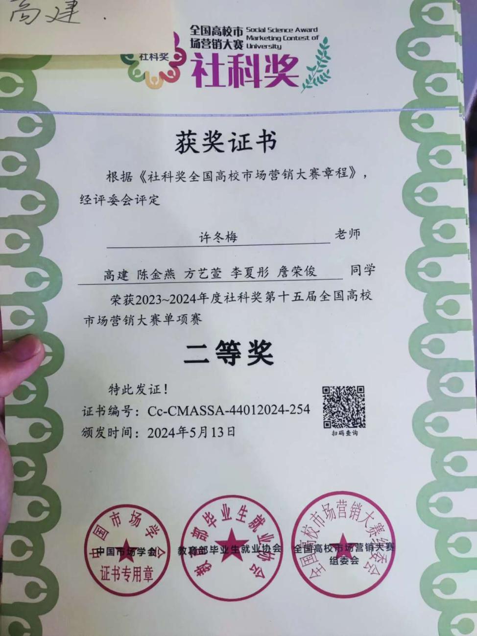 高建获社科奖中国高校市场营销大赛二等奖证书