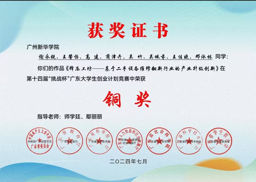高建获第十四届“挑战杯”广东大学生创业计划竞赛铜奖证书