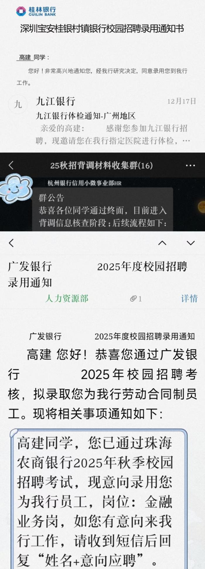 在竞争极其激烈的秋招战场上,高建凭借扎实的专业知识和出色的综合素养脱颖而出,一举斩获5个极具分量的offer。其中,包括来自“全国村镇银行一百强”、由“全球银行300强”桂林银行发起的深圳宝安桂银村镇银行;“全球银行五百强”并在2018年成功上市的九江银行;“全国十佳城商行”并在全球银行排名130位的杭州银行;大型央企中国人寿集团成员单位、连续3年入围国内系统重要性银行、全球银行排名60位的国有大型股份制商业银行广发银行;以及在珠海地区深耕多年、服务本地经济成效显著、“全球银行一千强”的珠海农商银行。这些offer不仅是对他过往努力的高度认可,更是他迈向金融领域的坚实起点。