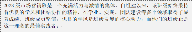 2023级市场营销班注重培养积极向上的班级文化,鼓励同学们相互学习、相互帮助,共同进步。班级定期举办班委会、班会、活动,丰富同学们的精神生活,提升文化素养。同时,班级鼓励同学们发挥创新精神,参与科研项目和创新竞赛。