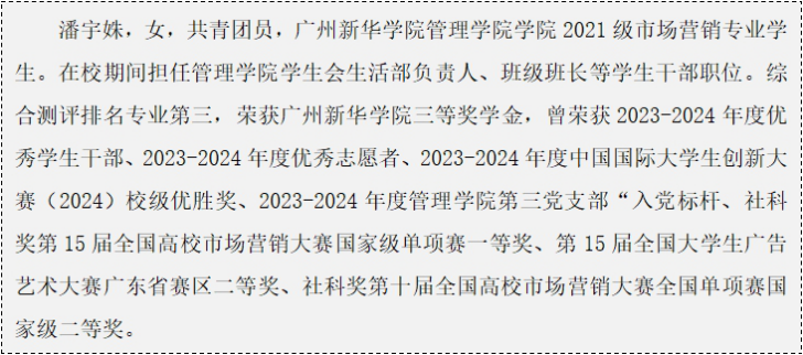 习古人云:“博学之,审问之,慎思之,明辨之,笃行之。”“千淘万漉虽辛苦,吹尽狂沙始到金。”哪怕道路崎岖、困难重重,也始终保持进取的热忱之心,永不止于当下。潘宇姝同学在岗踏入校园时,便立下了目标,于是她好学深思、艰苦奋斗,学分绩点、综合测评均名列前茅。在学习上,要始终保持求知若渴的态度,扎实掌握专业知识,同时积极参与各类比赛和实践活动,将理论与实践相结合,提升自己的综合能力。此外,我们还应心怀善意,积极帮助身边的同学,在互助中共同成长。大学不仅是个人能力的提升期,更是人格塑造的关键期。只有树立明确的目标,努力学习、勇于实践、乐于助人,才能在大学的舞台上绽放光彩,为未来的发展奠定坚实的基础,也为社会贡献自己的力量。