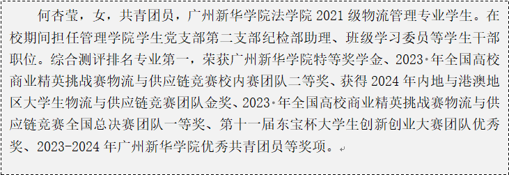 在大学期间,何杏莹积极投身学科竞赛。其中,2023 年全国高校商业精英挑战赛物流与供应链竞赛成为她大放异彩的舞台。在备赛阶段,她和团队成员面临诸多挑战。物流方案设计需要精准把握行业趋势、整合前沿技术,而当时团队成员对新技术的应用还不够熟练,且市场调研数据也不够完善。面对这些难题,何杏莹没有退缩。她与团队成员日夜查阅资料,研究大量物流行业的成功案例,深入分析市场需求和发展方向。同时,她积极联系专业老师和行业专家,虚心请教,不断优化团队的方案。