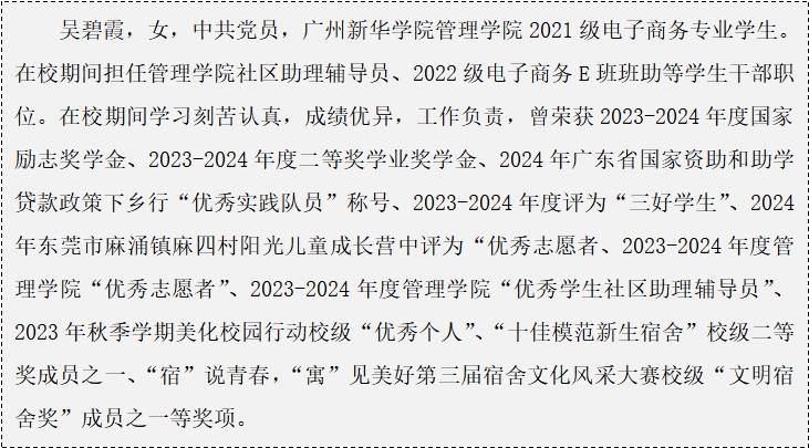 吴碧霞同学秉持 “知行合一” 的座右铭,在学业上认真学习专业课程,积极完成学习任务,与同学互帮互助,共同进步,并取得了优异的综测成绩,荣获“国家励志奖学金”、“华坤助学金”并荣获校级“三好学生”称号。她注重理论与实践结合,和宿舍成员营造出良好的学习氛围与居住环境,所在宿舍也获得校级 “十佳模范新生宿舍” 二等奖与 “文明宿舍奖” ,切实做到了勤学笃行,扎实地夯实了专业根基。