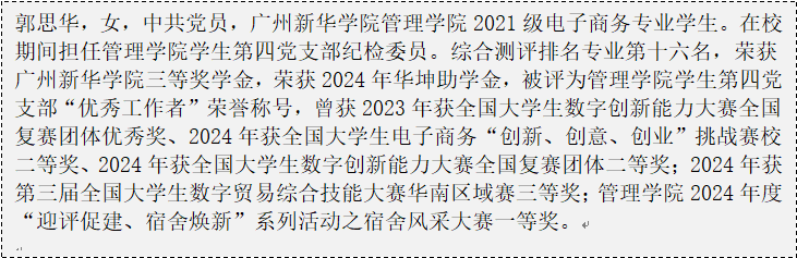 郭思华同学作为新时代新青年,怀揣着能够将个人力量汇聚于国家需要的科技方向。因此,她在个人成长道路上不断努力,专注于提升科技创新能力。她积极参与各类创新创业大赛,坚持理论与实践相结合,不仅自己不断学习进步,还鼓励并带动周围的同学一同提升创新精神和实际操作能力。