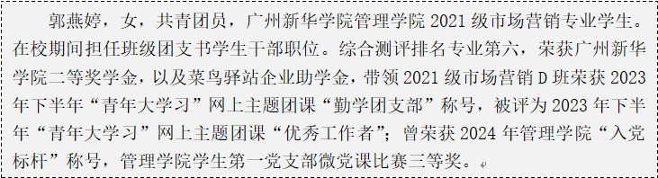习近平总书记在党的二十大报告中寄语广大青年要立志成为有理想、敢担当、能吃苦、肯奋斗的新时代好青年。郭燕婷,广州新华学院yl8cc永利线路检测中心2021级市场营销专业的学生,正是这样一位以实际行动践行这一嘱托的优秀青年。