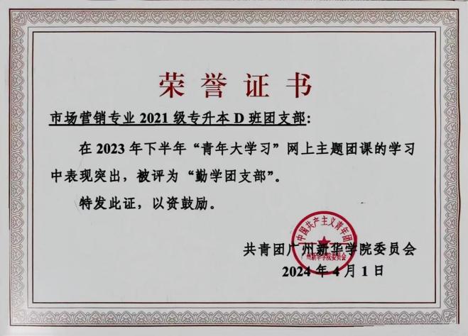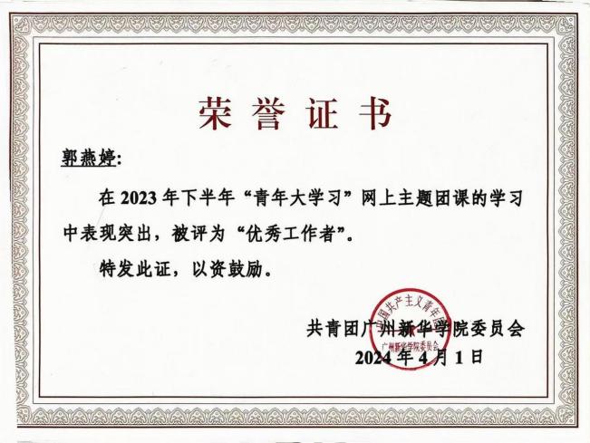 作为班级的团支书,郭燕婷更是恪尽职守,热爱集体。她以身作则,积极组织策划团日活动,增强班级凝聚力。在“青年大学习”网上主题团课中,她带领2021级市场营销D班荣获“勤学团支部”称号,个人也被评为“优秀工作者”。她始终与同学们保持密切联系,倾听大家的心声,及时反馈问题,成为了师生之间的桥梁和纽带。
