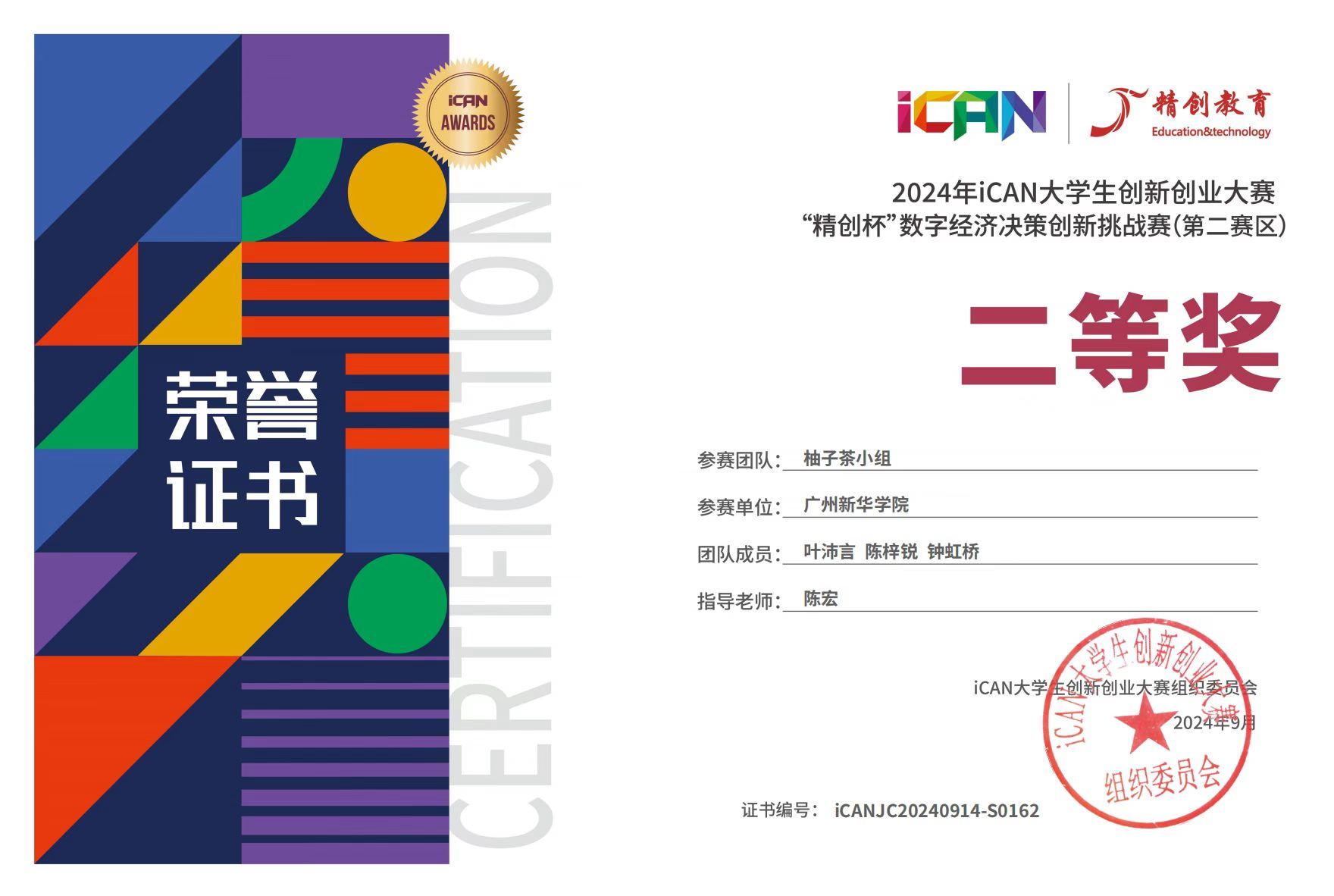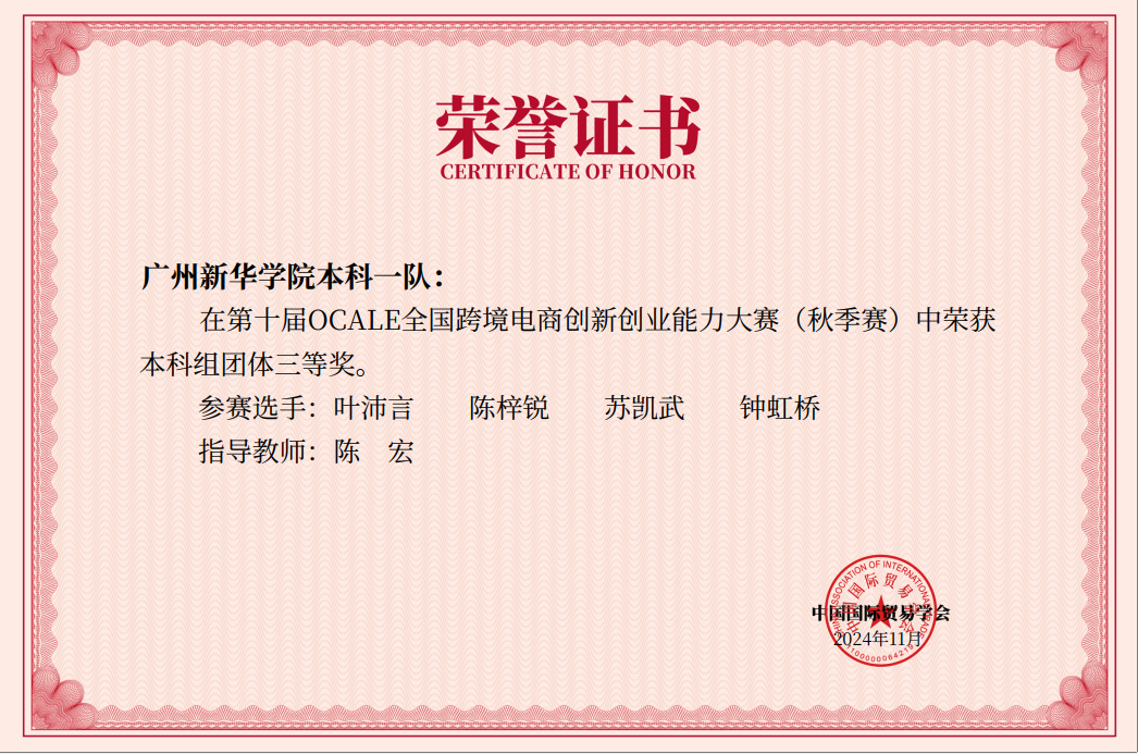 2024年,数字经济专业学生积极参与各类比赛,2023级36人累计参加23人次,在专业类赛事2024年iCAN大学生创新创业大赛“精创杯”数字经济决策创新挑战赛区域赛上获得1项二等奖,2项三等奖,在第十届OCALE全国跨境电商创新创业能力大赛获得3项个人三等奖及团体三等奖。