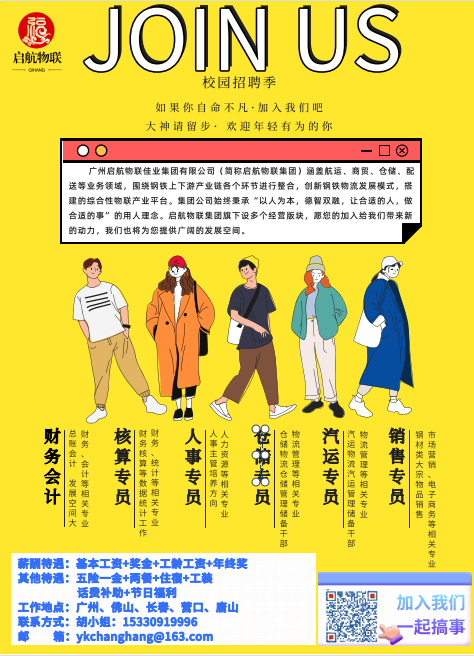 广州启航物联佳业集团有限公司(简称启航物联集团)涵盖航运、商贸、仓储、配送等业务领域,围绕钢铁上下游产业链各个环节进行整合,创新钢铁物流发展模式,搭建的综合性物联产业平台。集团公司始终秉承“以人为本,德智双融,让合适的人,做合适的事”的用人理念。启航物联集团旗下设多个经营版块,愿您的加入给我们带来新的动力,我们也将为您提供广阔的发展空间。