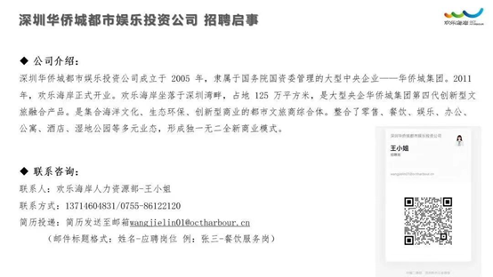 【就业招聘信息】深圳华侨城都市娱乐投资公司-前厅礼宾岗、餐饮服务岗、景区场馆服务岗、车船及闸口服务岗