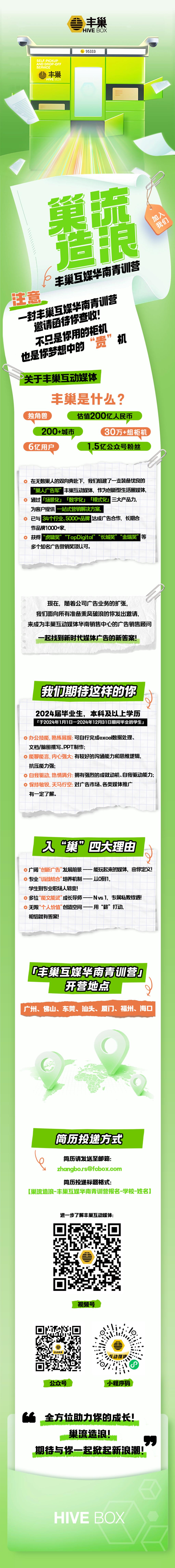 感兴趣的大四学生,可以在指定的邮箱投递简历,按照格式注明标题,国庆节后丰巢互动媒体会来学校进行企业宣讲和现场面试广州新华学院东莞校区的大四学生。以下有电子海报,上面有企业、岗位的介绍,以及公众号,小程序,视频号的二维码,同学们可以去了解企业的业务、案例等。