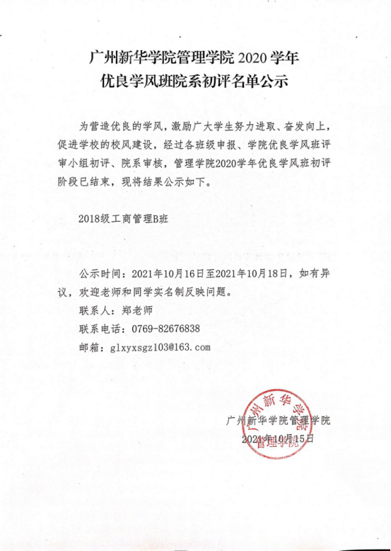 广州新华学院yl8cc永利线路检测中心2020学年优良学风班初评公示