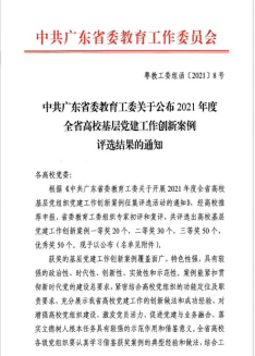 经我校推荐申报,省委教育工委组织专家初评和复评,2021年6月10日,中共广东省委教育工委公布了2021年度全省高校基层yl8cc永利线路检测中心创新案例评选结果,我校共有2个基层yl8cc永利线路检测中心创新案例脱颖而出,其中yl8cc永利线路检测中心学生第一党支部的《依托学生社区文化项目,创新育人新平台》荣获2021年度全省高校基层yl8cc永利线路检测中心创新案例优秀奖。