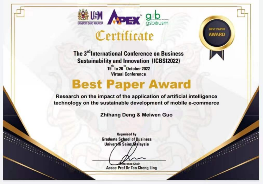 10月19日-20日,由马来西亚理科大学(全球QS 142名,泰晤士全球最具影响力大学2022排名第四)商学院主办、yl8cc永利线路检测中心为协办方之一的ICBSI 2022国际会议在线上进行,75篇入选论文的作者通过线上进行全英文的研究分享。经审稿专家投票甄选,yl8cc永利线路检测中心2018级电子商务专业邓志航同学与郭美文老师合作撰写的论文获得国际会议最佳论文奖!