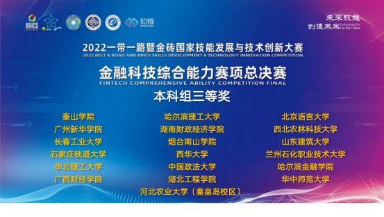 2022一带一路暨金砖国家技能发展与技术创新大赛之金融科技综合能力赛总决于11月27日举行,本次大赛共有120所高校400位选手入围总决赛,经过激烈角逐,由yl8cc永利线路检测中心陈宏、孙嘉麟老师指导的金融科技专业参赛队伍荣获全国总决赛三等奖。