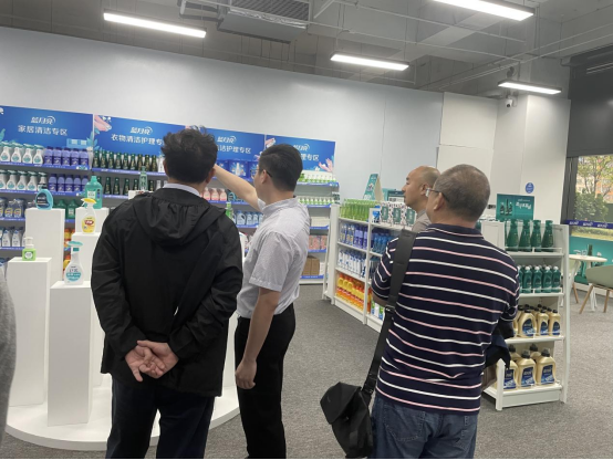 最后,彭建平院长一行参观了蓝月亮琳琅满目的线下样板店,通过刘杰浩经理对产品的讲解,院长和老师们进一步了解了企业背景、发展情况及产品特色。在产品介绍中,刘杰浩经理负责人表示每款产品都贴近于人们的生活,并且为不同岗位人士都打造了相应的产品,以满足不同购买群体的需求,同时蓝月亮线下店铺还结合美学和人体工学对产品进行摆放与展示。