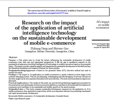 论文链接:https://www.emerald.com/insight/search?q=Research+on+the+impact+of+the+application+of+artificial+intelligence+technology+on+the+sustainable+development+of+mobile+e-commerce+of