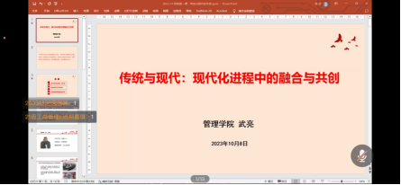 2023年10月8日晚上,管理学院党总支书记武亮以“传统与现代:现代化进程中的融合与共创”为主题,通过线上会议方式为管理学院各支部学生及教师讲授。武书记围绕“现代化的辩证视角双刃剑”,“现代化是一个历史范畴”,“传统在现代化中的作用正确处理传统与现代的关系”等三个方面来进行讲解。