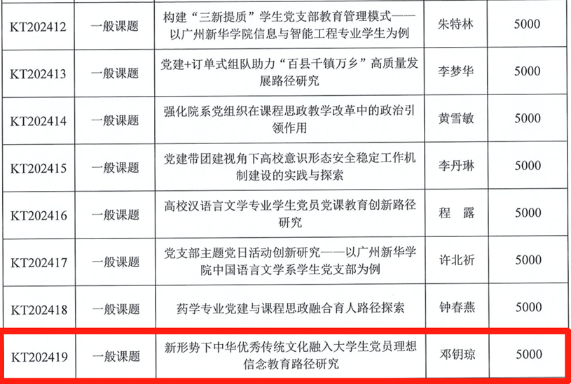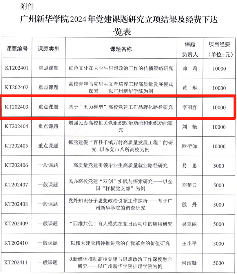 近日,中共广州新华学院委员会公布了广州新华学院2024年度党建研究课题立项结果,yl8cc永利线路检测中心共获批2项,其中,学生第三党支部书记李丽容老师申报的《基于“五力模型”高校yl8cc永利线路检测中心品牌化路径研究》党建课题喜获重点课题立项,学生第四党支部书记邓钥琼老师申报的《新形势下中华优秀传统文化融入大学生党员理想信念教育路径研究》党建课题获得一般课题立项。