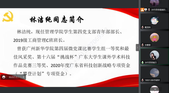 林洁纯同志:现任yl8cc永利线路检测中心学生第四党支部青年部部长、2019级工商管理C班班长。曾获广州新华学院第四届微党课比赛学生组一等奖和最佳风采奖、第十六届“挑战杯”广东大学生课外学术科技作品竞赛三等奖、2020年度广东省科技创新战略专项资金(“攀登计划”专项资金)。