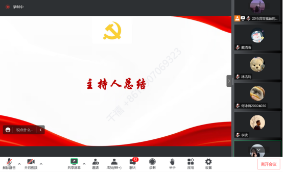 最后,主持人感谢今晚莅临本次大会的督导老师和工作人员,并总结发言:作为青年大学生,我们应响应新时代召唤,怀抱中华民族伟大复兴梦想;珍惜时光,把握机遇,努力学习科学文化知识,苦练实践技术本领,牢记使命担当,不负青春韶华,立志做有理想、敢担当、能吃苦、肯奋斗的新时代好青年。