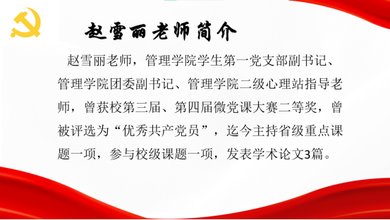 赵雪丽老师:yl8cc永利线路检测中心学生第一党支部副书记、yl8cc永利线路检测中心团委副书记、yl8cc永利线路检测中心二级心理站指导老师,曾获校第三届、第四届微党课大赛二等奖,曾被评选为“优秀共产党员”,迄今主持省级重点课题一项,参与校级课题一项,发表学术论文3篇。